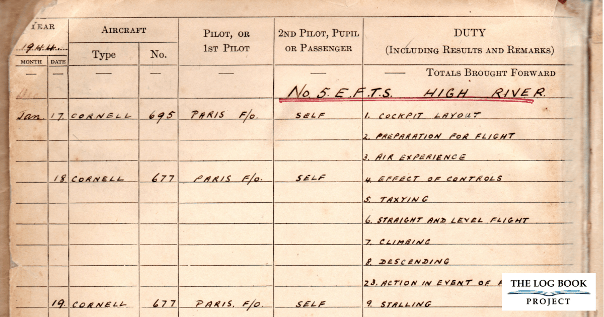 Today’s date has come to hold a special meaning for the project as it was on 17 January 1944 that Cyril Devaux made his first flight entry in his log book. He records his first 40 mins of flight training at No 5 EFTS High River in Canada in Fairchild Cornell FJ695 with instructor F/O Paris.