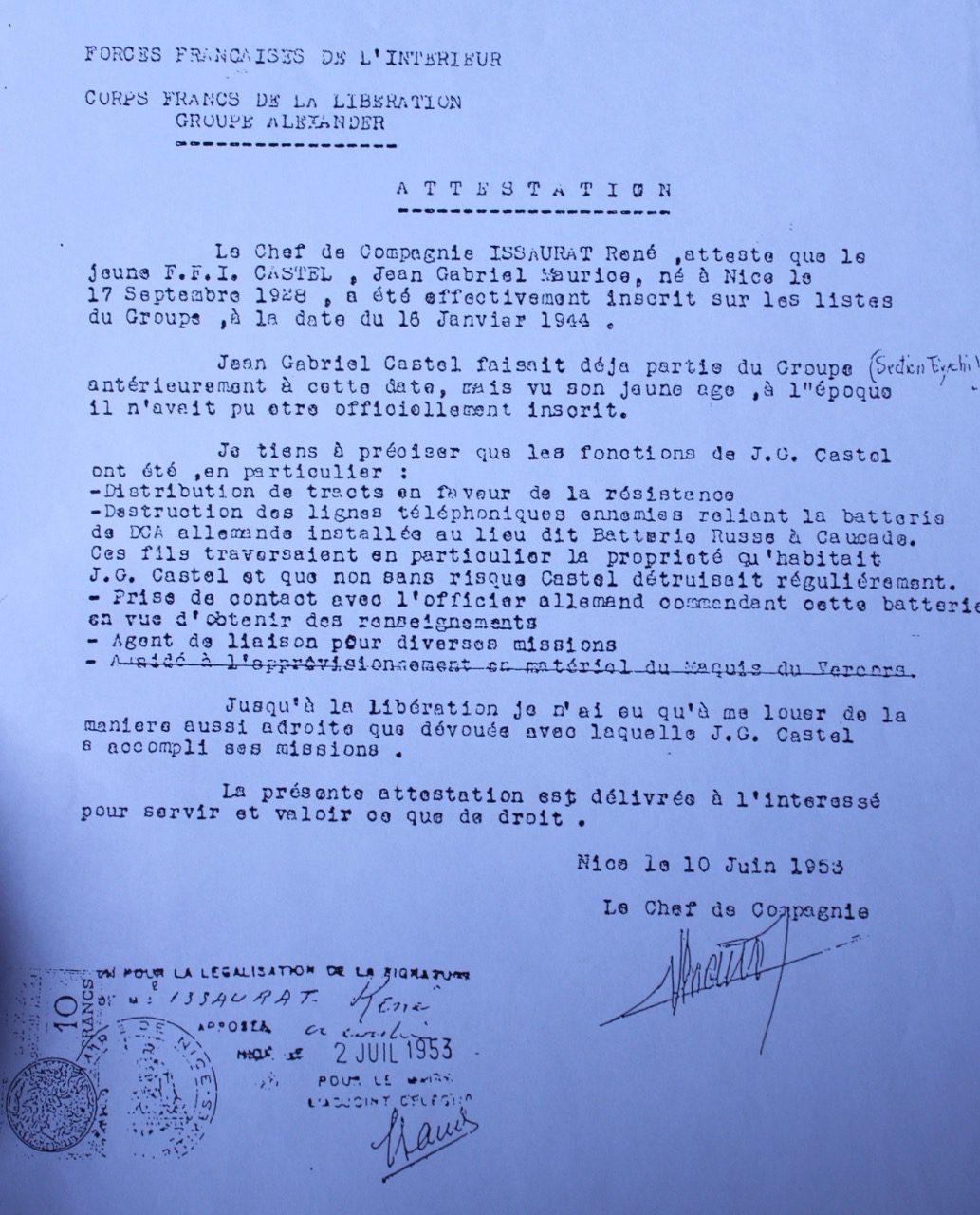 In 1953 the Company Commander of ‘Corps Francs de la Liberation Groupe Alexander’, René Issaurat, issued a letter of commendation. The letter certifies how Castel was formally part of the group since 16 January 1944. It was however pointed out that:
